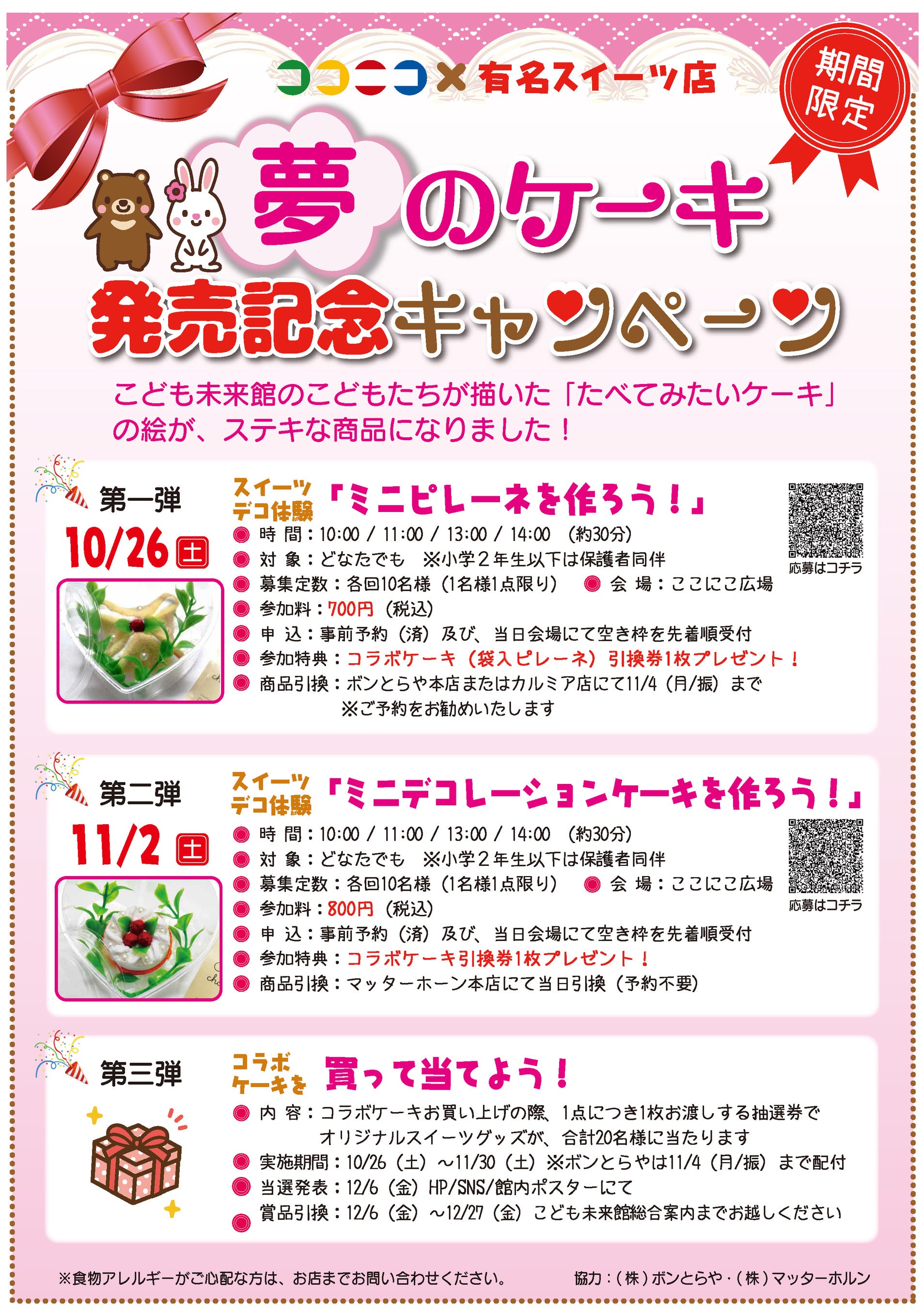 こども未来館ココニコにて、商品化したケーキの引換券がもらえるスイーツデコ体験ワークショップを10月26日(土)、11月2日(土)に開催します。