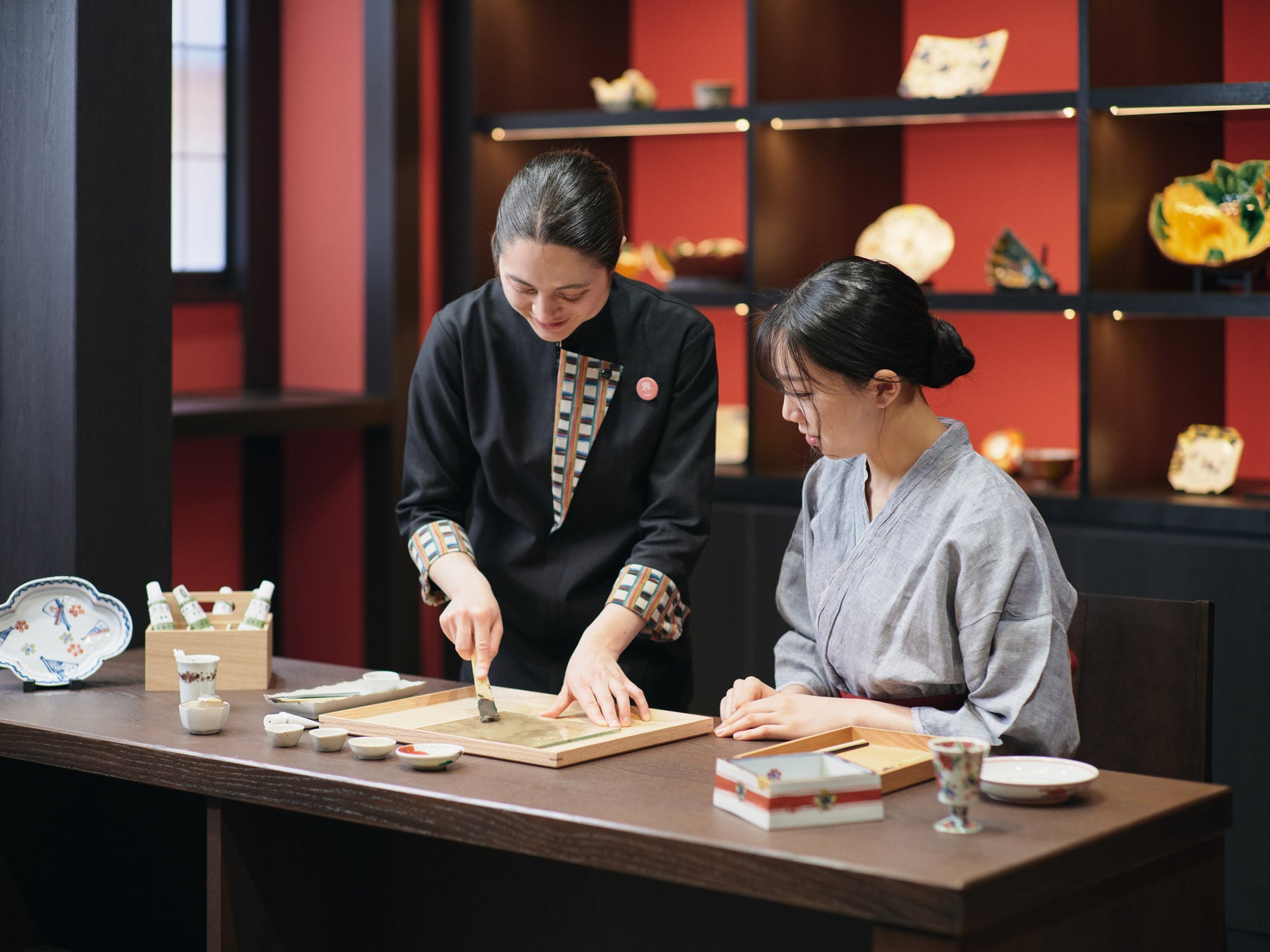 2021年には、宿泊者にも金継ぎの技術や器を大切に扱う想いを知っていただきたいと考え、器に施された金継ぎを解説する「金継ぎ語り」、金継ぎされた抹茶椀を使った茶の湯にまつわる体験、金継ぎでアクセサリーを作るワークショップなども開催し、好評の声をいただきました。また、スタッフ内で金継ぎ文化に対する興味が深まったことを受け、難易度の高い天然漆にこだわった器の修復や定期的なスタッフ向けのワークショップ開催など、より本格的に金継ぎの活動に取り組んでいくため、2023年4月19日に界 加賀施設内に「金継ぎ工房」が誕生するとともに、宿泊者が金継ぎの一部の作業を体験できるプログラム「金継ぎいろは」をスタート。現在、工房では、天然漆と自然の材料を用いた本格的な技法で、スタッフ自らが日々、修復作業を行うほか、宿泊者は修復作業の見学、作業への参加ができ、その後滞在中の様々な場面で九谷焼をはじめとした工芸品に触れることで、器を取り巻く豊かな文化に触れることができます。
