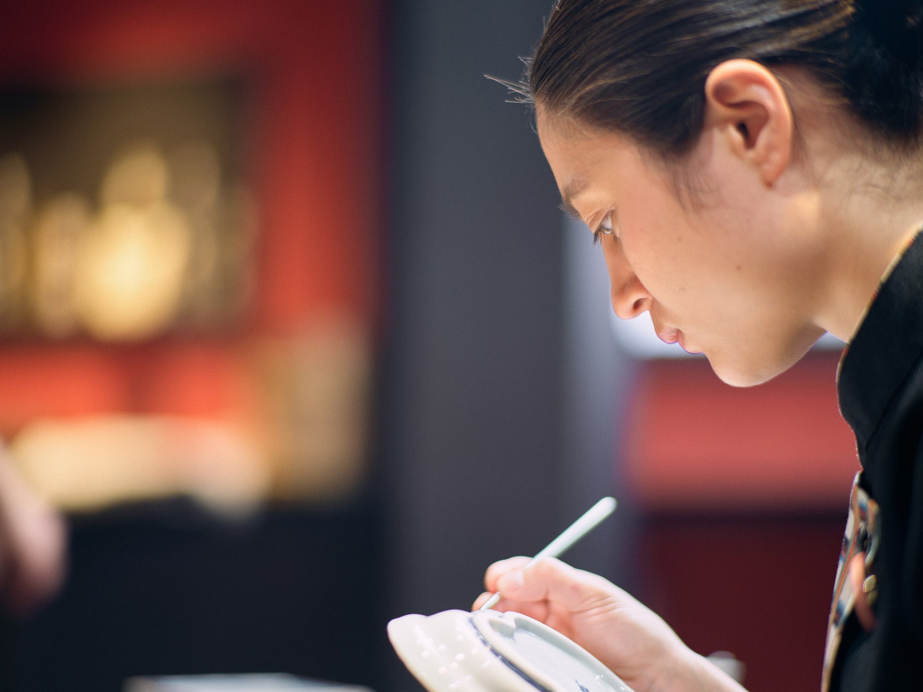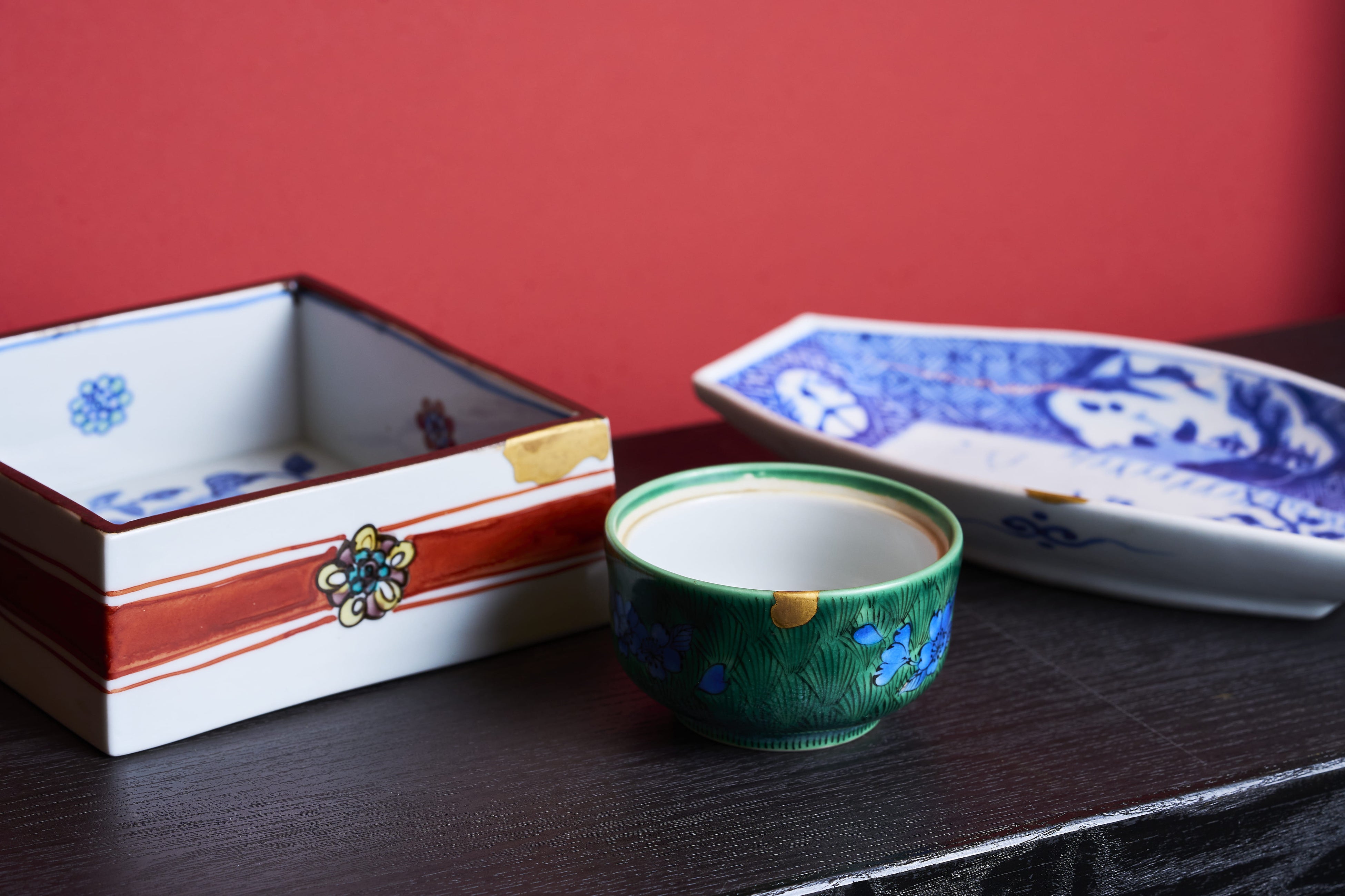 界 加賀では、当館ゆかりの文化人である北大路魯山人の「器は料理の着物」という言葉に倣い、器と料理のマリアージュにこだわり、器を宝物として大切に扱っています。しかしながら、2015 年の開業当初より、九谷焼や山中塗の作家の器を用いてきたものの、毎日使用することにより、どうしても器の劣化や破損が生じてしまいます。それを廃棄するのはもったいないと感じた元蒔絵師(*3)のスタッフが、自分たちの手で大切な器を守っていくことを目的に2019 年から金継ぎの技術を界 加賀のスタッフに広めました。