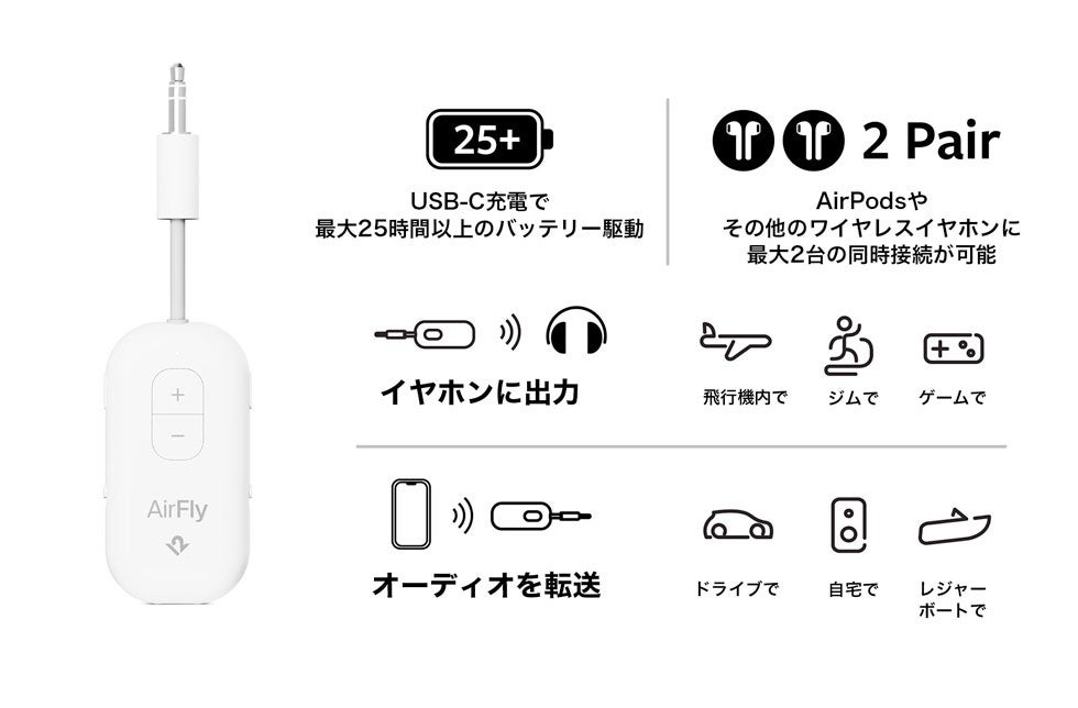 AirFly Pro 2 Deluxeは、3.5mmオーディオジャック搭載デバイスでBluetoothイヤホンを最も簡単に使えるようにする旅行の際の飛行機内の必需品です。 通常の機内エンターテイメントシステムはもちろん、AiFly Pro 2 Deluxeには、一部の飛行機が採用しているデュアルジャックでもAirFly Pro 2が使用できるようにデュアルプラグ変換アダプタが付属しています。その他、スポーツジムのマシン、Bluetooth接続できない携帯音楽プレーヤーなどのデバイスに接続すれば、ケーブルなしで高音質をお楽しみいただけます。最大2台のイヤホンをペアリングして同じデバイスの音声を共有して一緒に楽しんだり、ストリーミングモードに切り替えてスマートフォンの音声を車の中やホームスピーカーに送ったりすることも可能です。直感的な操作が可能な物理的な2つのペアリングボタンと音量ボタン、そして25時間超のバッテリー駆動時間を備えたAirFly Pro 2 Deluxeは、どこにいても直感的な操作で簡単にワイヤレス接続でき、長時間ストレスなくサウンドをお楽しみいただけます。