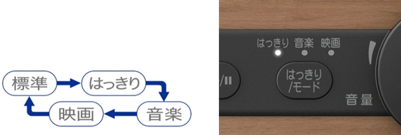 人の声の周波数帯域を増幅し、ドラマや映画のセリフ、アナウンサーの声などを聞き取りやすくする「はっきり音声」機能を搭載。また視聴ソースに合わせて選べる「はっきり」(「はっきり音声」)「音楽」「映画」の3つのサウンドモードを搭載しました。「はっきり/モード」ボタンを押すことで切り替えが可能です。