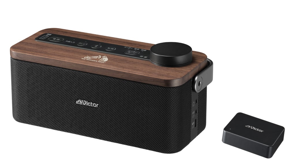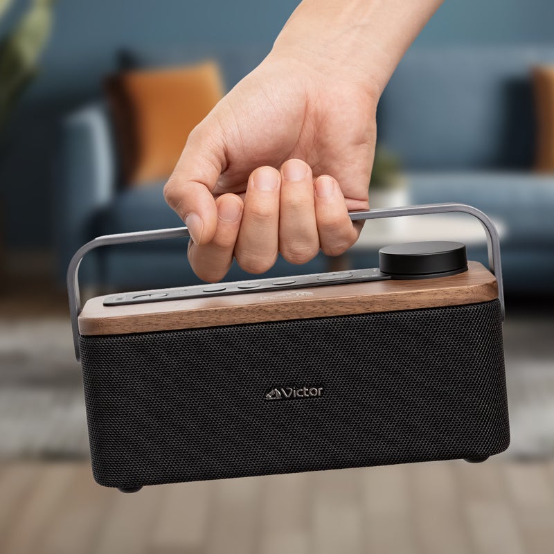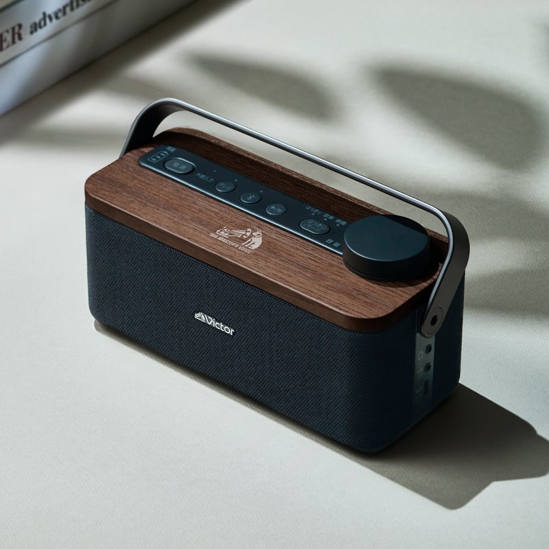 スピーカー部の天板にはインテリアと相性の良い天然木(ウォルナット)を、ハンドル部には落ち着きのあるアルミダイキャストを採用し、上質で機能的かつ、インテリアになじみやすいデザインに仕上げました。また、Victorブランドを象徴する「犬のマーク」をワンポイントでプリントしています。