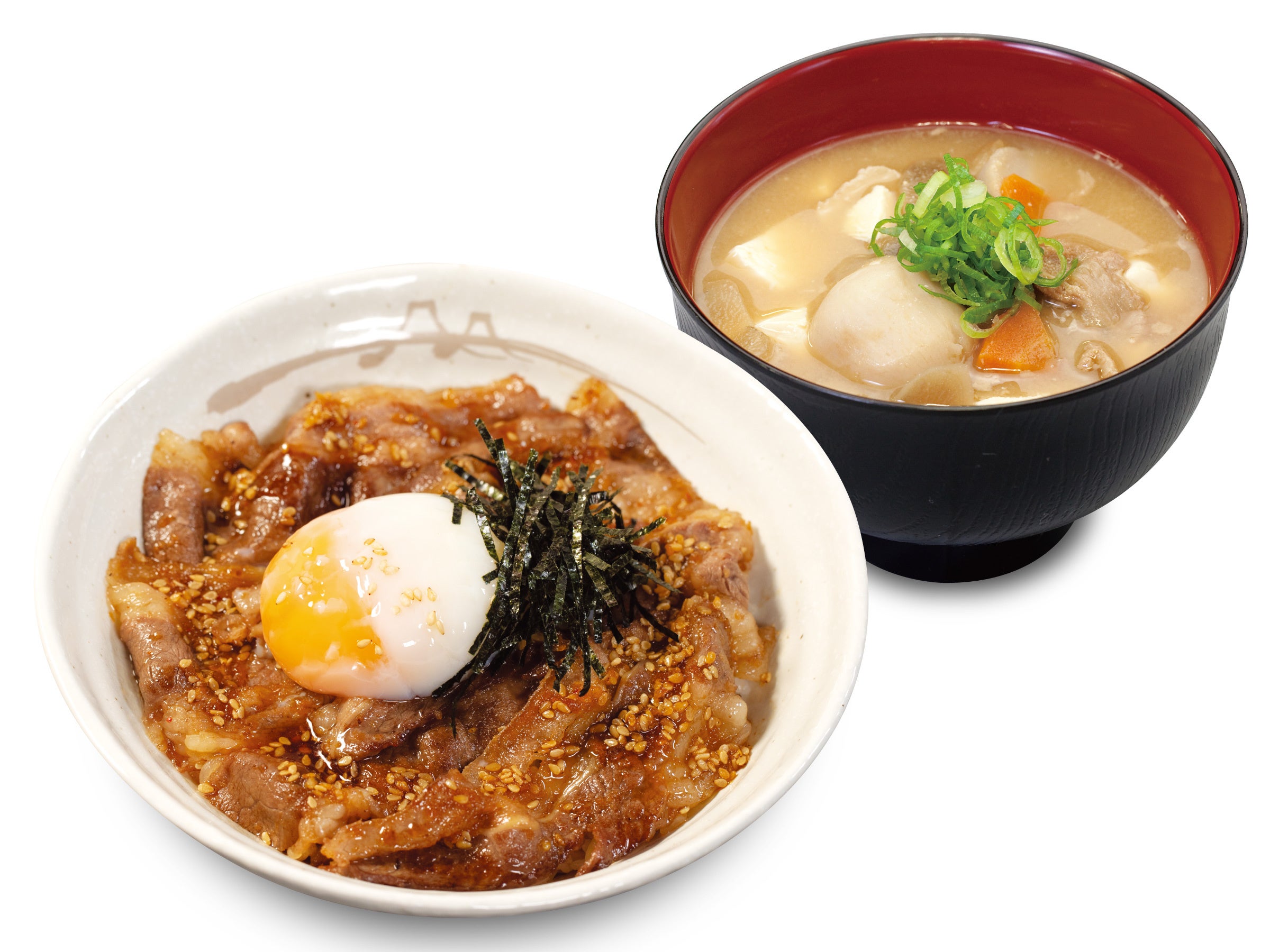 「旨味醬油焼き牛めし」は刻み海苔に白胡麻、ちょっぴり甘めのタレが牛肉の旨味を引き立てます。こちらは不動の人気を誇る具沢山な「豚汁」が付いた「豚汁セット」も販売。「元祖旨辛焼き牛めし」「旨味醤油焼き牛めし」ともに、松屋の看板「牛めし」のお肉とのコンボも同時に登場。肉コンボでボリュームも満足感も満点です。
