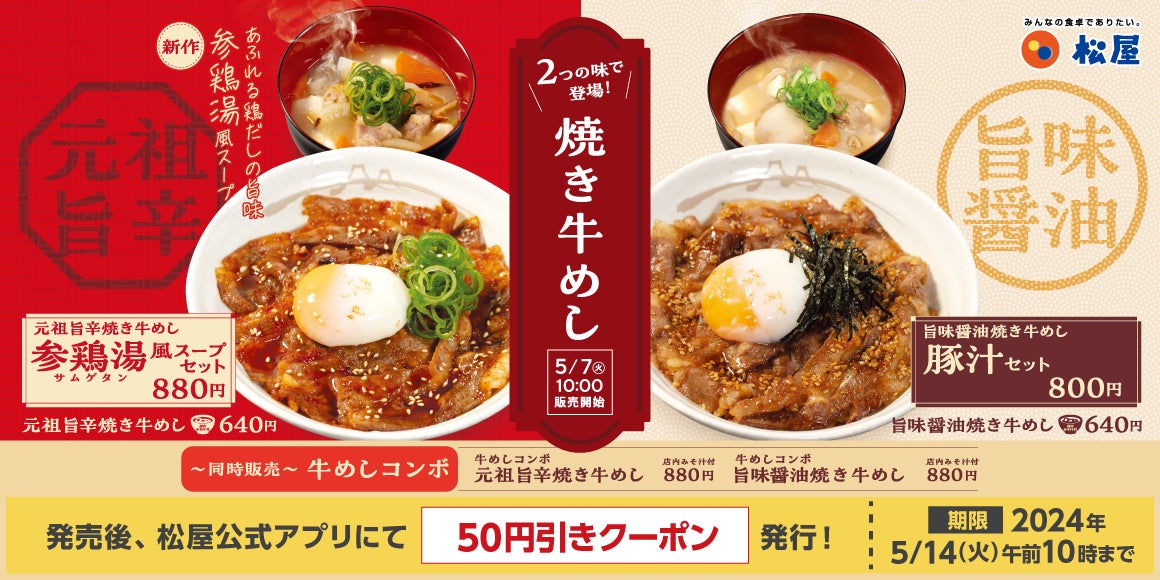 このたび松屋フーズ(本社:東京都武蔵野市、代表取締役社長:瓦葺一利)では、牛めし・カレー・定食・その他丼の「松屋」におきまして、2024年5月7日(火)10時より「元祖旨辛焼き牛めし」「旨味醬油焼き牛めし」「参鶏湯風(サムゲタン)スープ」を販売いたします。