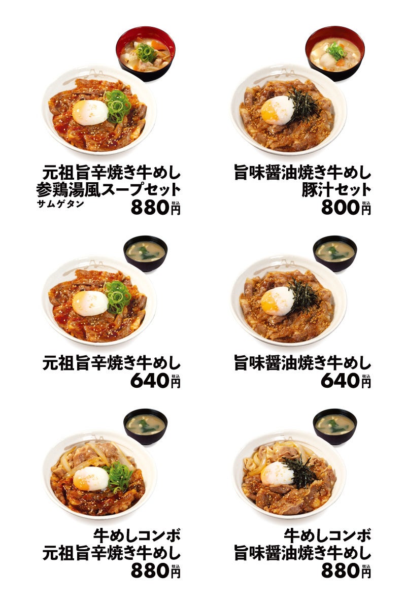 商品名 元祖旨辛焼き牛めし 640円 元祖旨辛焼き牛めし参鶏湯風スープセット 880円 牛めしコンボ旨辛焼き牛めし 880円 旨味醬油焼き牛めし 640円 旨味醬油焼き牛めし豚汁セット 800円 牛めしコンボ旨味醬油焼き牛めし 880円 参鶏湯風スープ 290円 ※お持ち帰りいただけます。お持ち帰りにみそ汁は付きません。 お持ち帰りの場合、みそ汁は別途60円でお求めいただけます。 ※「元祖旨辛焼き牛めし参鶏湯風スープセット」「旨味醬油焼き牛めし豚汁セット」にみそ汁は付きません。 ※税込み価格です。 ※株主優待券は上記メニューにご使用いただけます。 発売日 2024年5月7日(火)午前10時 ~ 対象店舗 一部店舗を除く全国の松屋 |