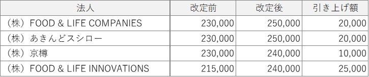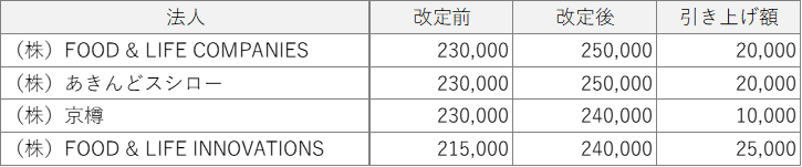 株式会社FOOD & LIFE COMPANIES(本社:大阪府吹田市、社長執行役員 CEO:山本 雅啓、以下「F&LC」)は、2024年10月1日からの給与制度改定により、国内グループの全正社員約2,900人を対象に平均6%の給与引き上げを実施しました。また、この一環で新卒初任給の引き上げも実施しましたのでお知らせいたします。