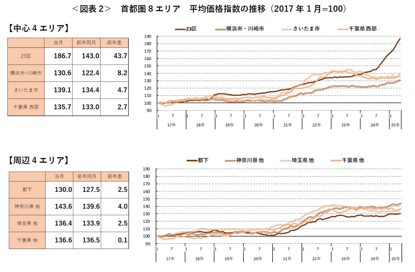 エリア別では、前月比で千葉県西部が下落した一方、他の7エリアは上昇した。前年同月比では、さいたま市が17カ月ぶりに上昇するなど8エリア全てで前年同月を上回った。8エリア揃って前年同月を上回るのは2023年8月以来21カ月ぶり。