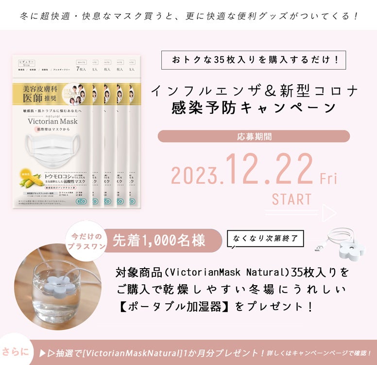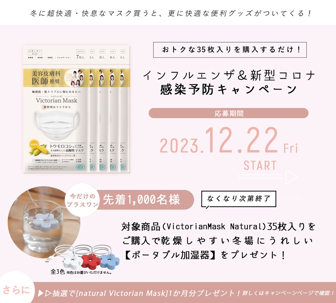 【先着1000名様限定】“美容皮膚科医師 推奨” natural Victorian Maskの35枚入りを購入していただいた方に「ポータブル加湿器」をプレゼント!Wチャンスで同商品が当たる企画も!