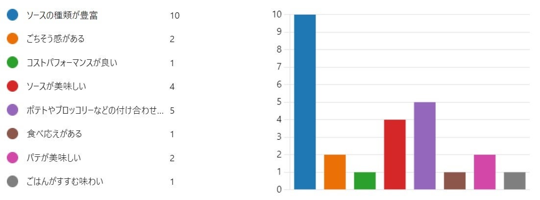最も多くの票を集めたのは『ソースの種類が豊富』というポイントでした。以下2位は『ポテトやブロッコリーなどの付け合わせが嬉しい』、『ソースが美味しい』でした。