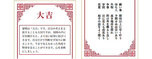 新年の風物詩であるおみくじ。毎年、ドキドキしながらおみくじを引き、その年の吉凶を見る方も多い事でしょう。『木下レオンの占い』ではお手元で本格的なおみくじをお楽しみいただけます。