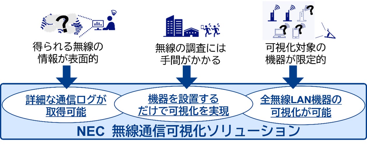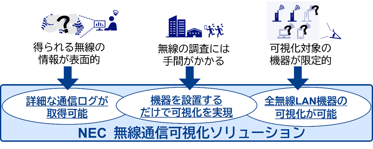 「NEC 無線通信可視化ソリューション」では、対象エリアに無線センサを設置するだけで、全ての無線LAN機器の通信品質のモニタリング及び詳細な通信ログの取得が可能になります。これにより、リアルタイムだけでなく過去の状況も含めた無線LANのヘルスチェックが可能になり、トラブルの解決やエリア設計の最適化に貢献します。