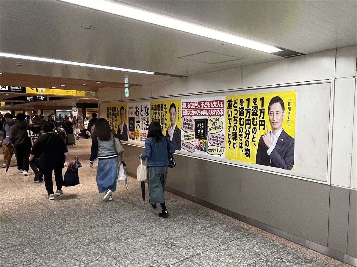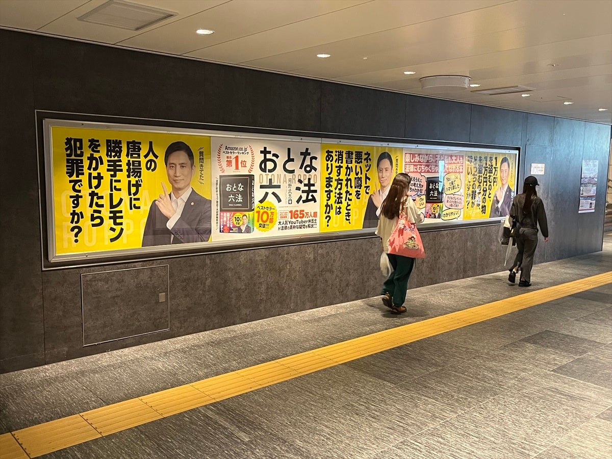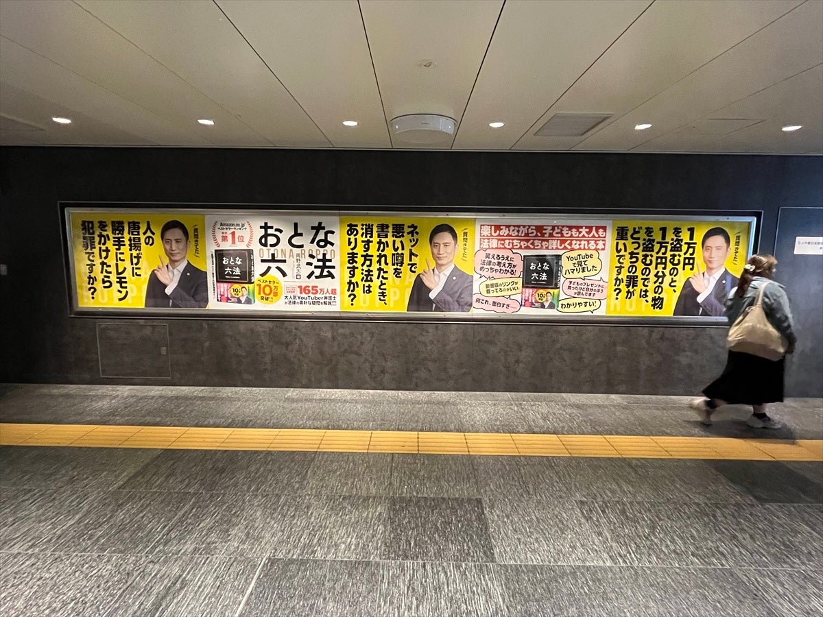 また、首都圏の5つの駅(東京駅・池袋駅・横浜駅・大宮駅・千葉駅)では、駅貼りポスター広告も実施。著者であり、YouTube登録者数166万人、TikTokフォロワー68万人を誇る岡野タケシ弁護士の写真をメインビジュアルに、千葉駅ではB0サイズ(横約1.4m×縦約1m)のポスターを、それ以外の4つの駅ではB0サイズ×5枚(横約7m×縦約1m)の5連ロングポスターで、5月5日まで掲示中です。