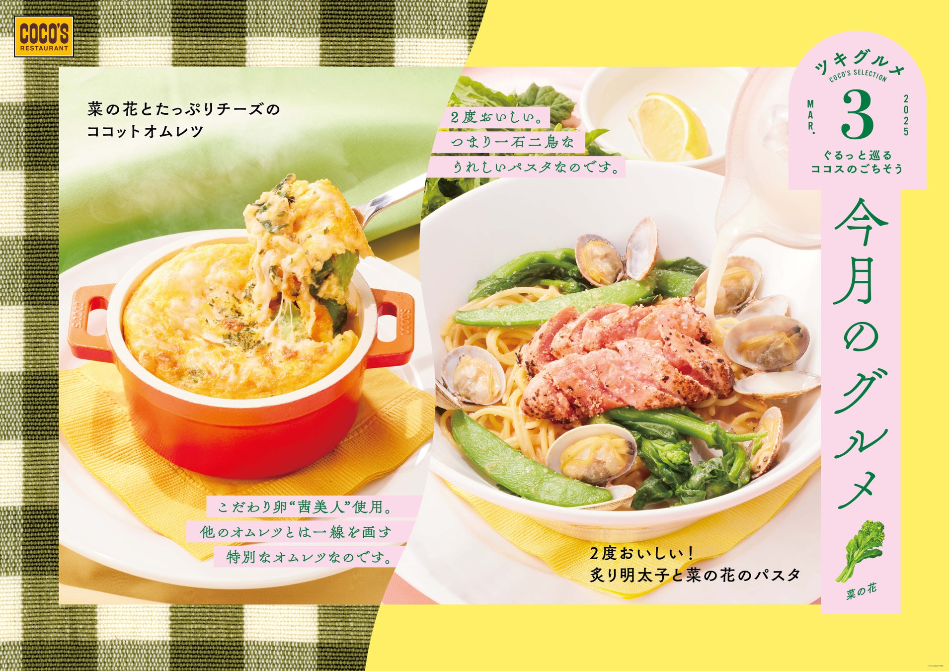 【ココス】旬の菜の花を使用した春らしいパスタとオムレツが登場!ココス「今月のグルメ~3月~」を開催!