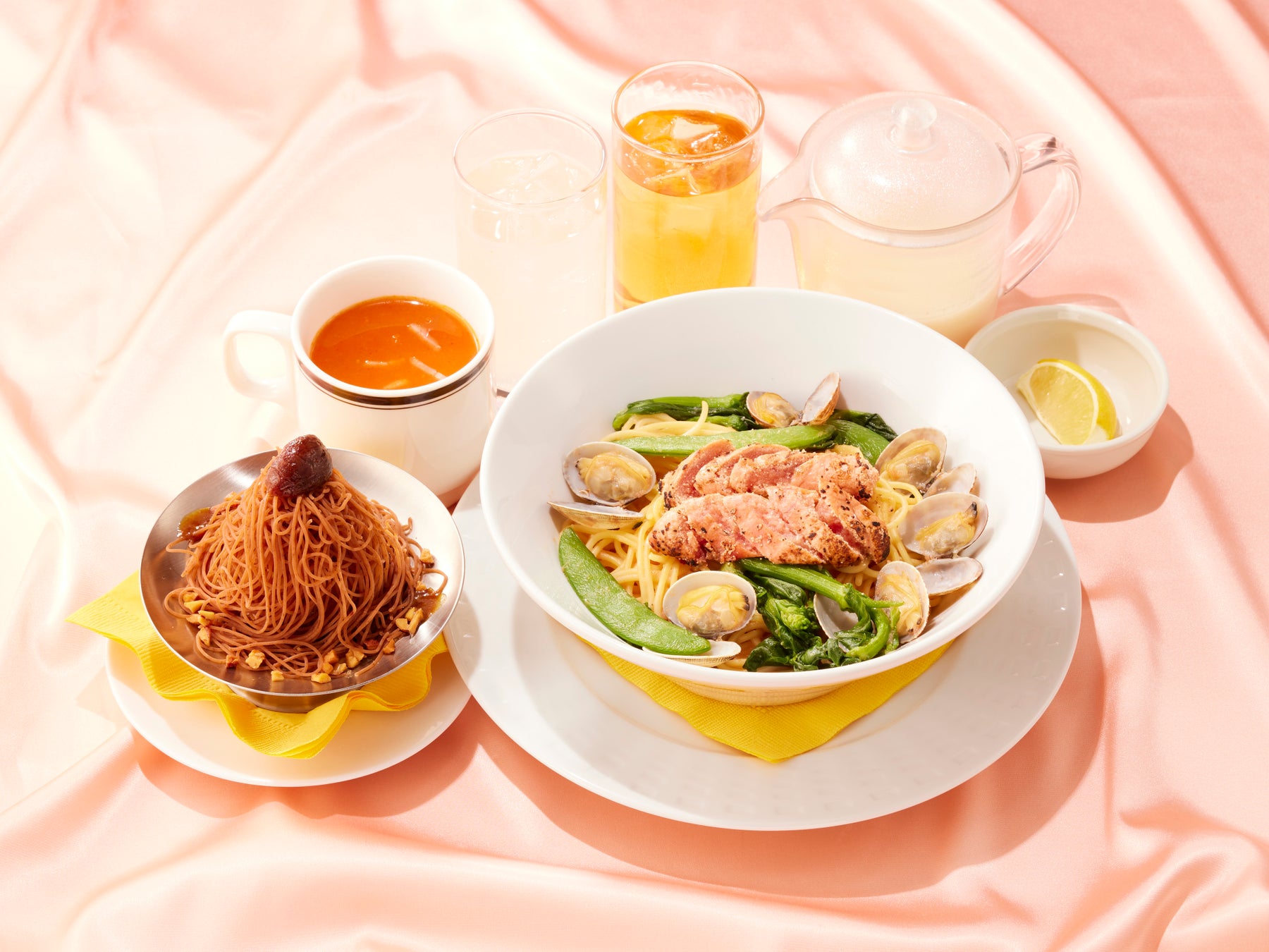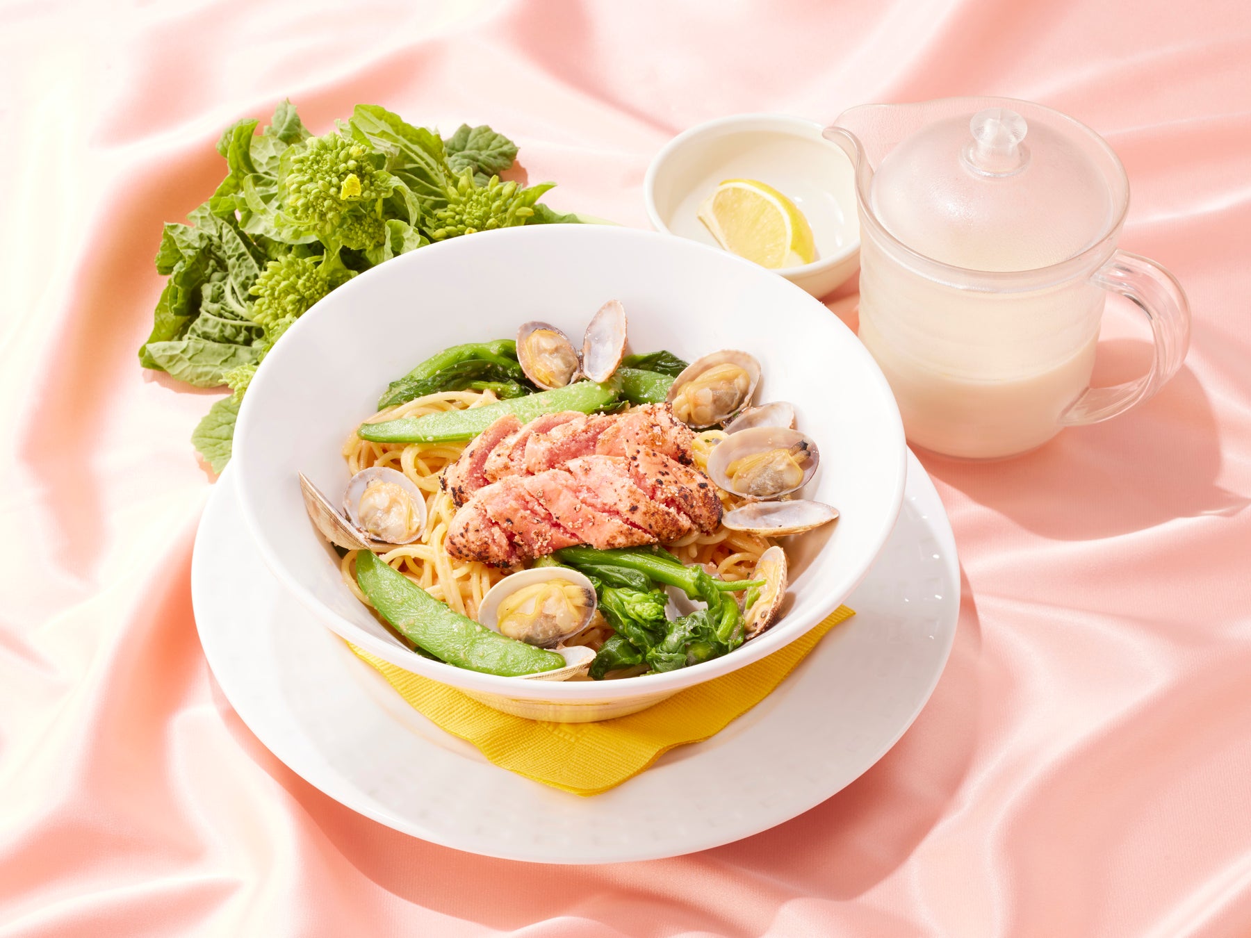 「2度おいしい!炙り明太子と菜の花のパスタ」は、旬の菜の花やスナップエンドウ、アサリを使用した春らしい具沢山のパスタです。炙った明太子のコクが菜の花のほろ苦さやアサリの旨みと相性抜群。さらに、別添えのレモンを搾ったり、出汁の風味が感じられる和風クリームスープをかけたりすることで、味わいの変化をお楽しみいただけます。