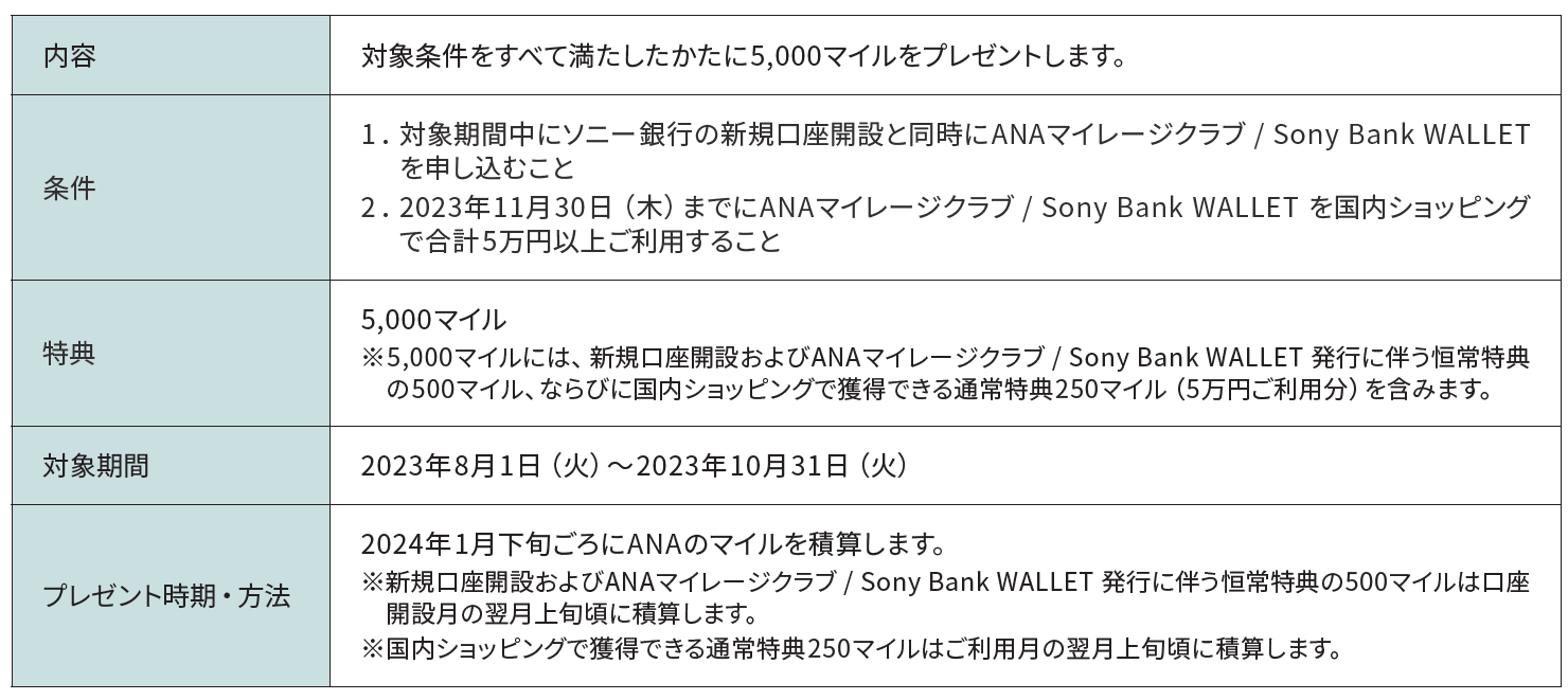 ソニー銀行株式会社(代表取締役社長:南 啓二/本社:東京都千代田区/以下 ソニー銀行)は、全日本空輸株式会社(代表取締役社長:井上 慎一/本社:東京都港区/以下 ANA)と「新規入会と5万円のカードご利用でもれなく5,000マイルプレゼントキャンペーン」を2023年8月1日(火)より実施しますのでお知らせいたします。