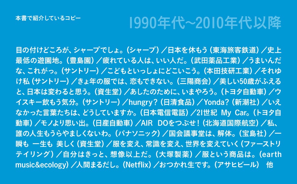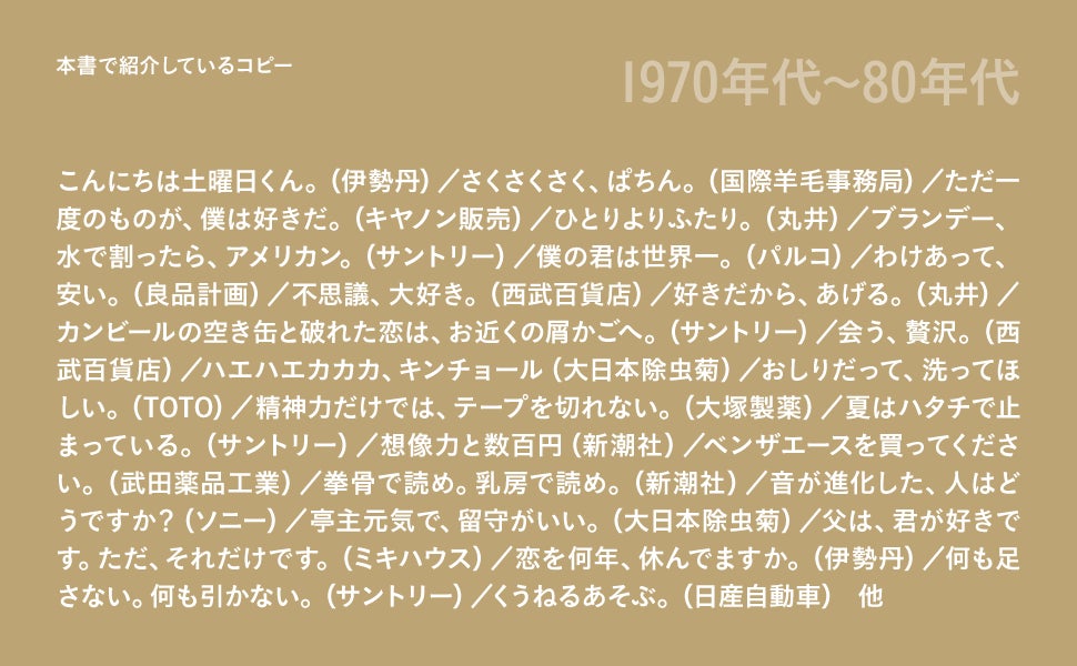 そこで本書では、コピーを書いたご本人(あるいは一緒に仕事をしていた人、ゆかりのある人など)に、当時の時代背景とともに、どのような考えやアイデアでそのコピーが生まれてきたのかを解説いただくことにしました。