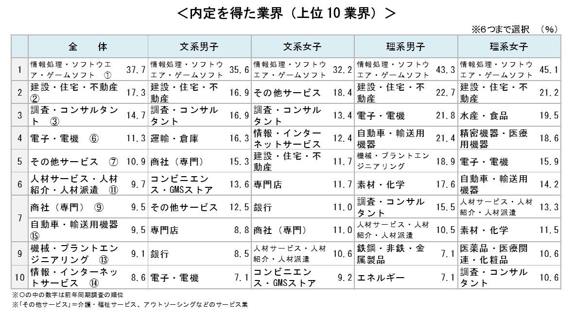 ○「情報処理・ソフトウエア」に内定が集中。文理男女問わず1位に