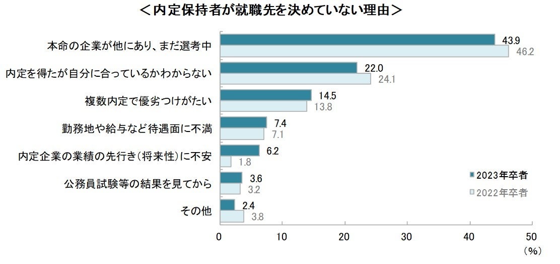 ○「本命の企業がまだ選考中」(43.9%)、「自分に合うかわからない」(22.0%)の順