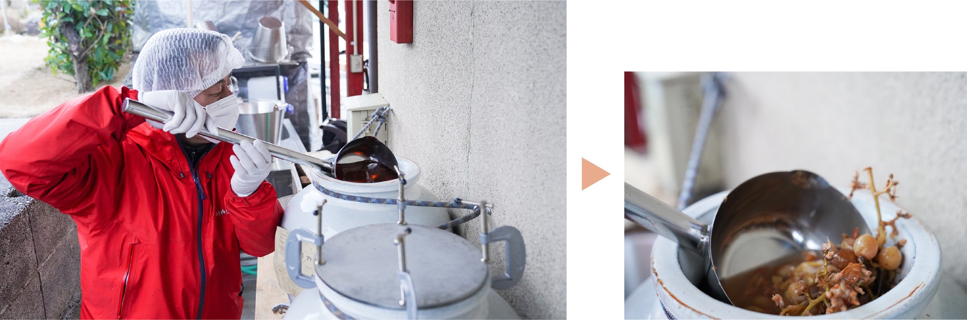 窯元「嘉祥窯」と共同開発した壺で醸造作業をおこなう渋谷氏