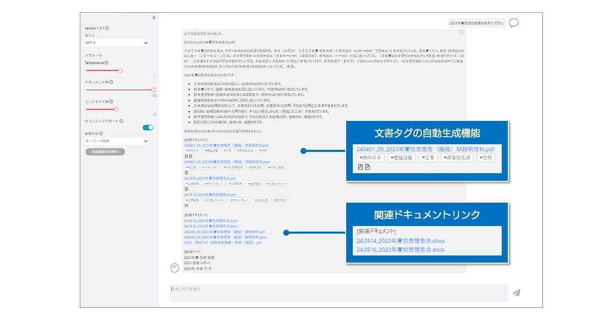検証システムではプロンプト(指示文)を入力することで、建設部門データの中から関連性のある情報を基に回答文を生成することができ、また各種パラメーターによって、生成AIの回答傾向を調整できます。