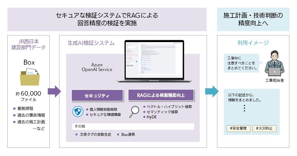 本実証実験は、JR西日本の建設部門が保有する膨大な鉄道建設工事に関するドキュメントに、生成AIによる回答精度の有用性を検証することを目的としています。過去の知見や技術ノウハウが蓄積されているデータを利活用することで、若手技術者の技術判断の精度向上を目指します。