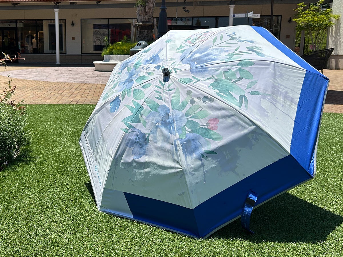 ■デザイン:プレミアム・アウトレットの屋外景観との調和を意識した、雨に濡れると青色の花模様が出現するオリジナルデザインです。内側には施設担当者が想いを込めた「Love Every Weather」というメッセージをあしらいました。日傘にもご利用いただける仕様です。
