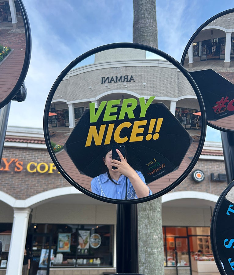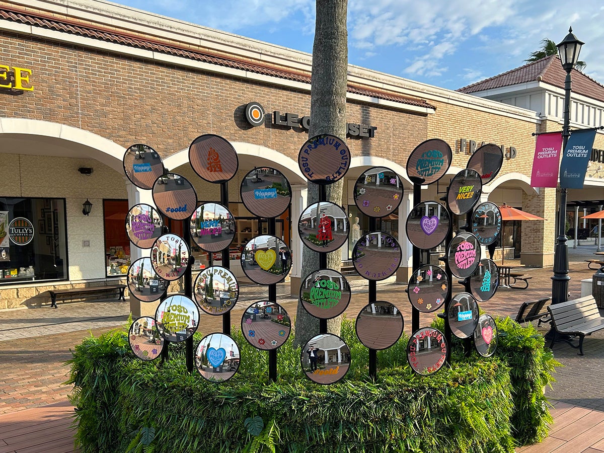 ■内容:表面に丸みのある鏡を32枚配置したフォトスポットです。鏡には「ootd(outfit of the day 今日のコーデ)」や「HAPPY」、「TOSU PREMIUM OUTLETS®」など、それぞれ異なるメッセージのグラフィックデザインを施しています。晴れの日はもちろん、雨の日も傘をもった姿や、雫や丸みをもった鏡による反射による幻想的な景色など、雨の日ならではの撮影をお楽しみいただけます。