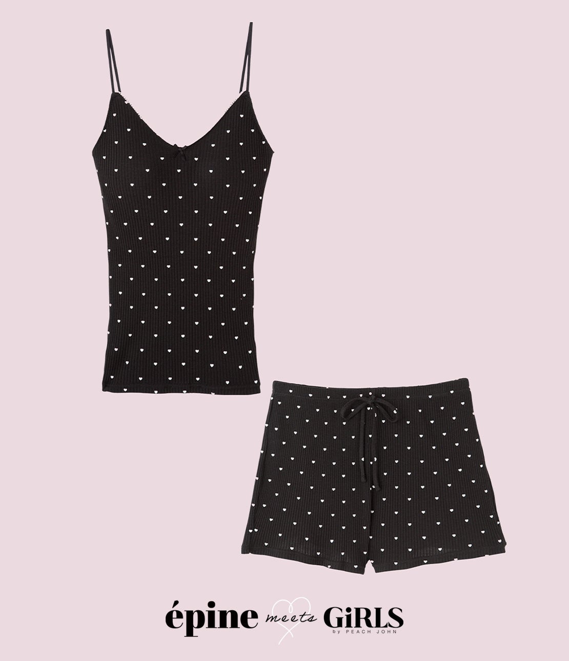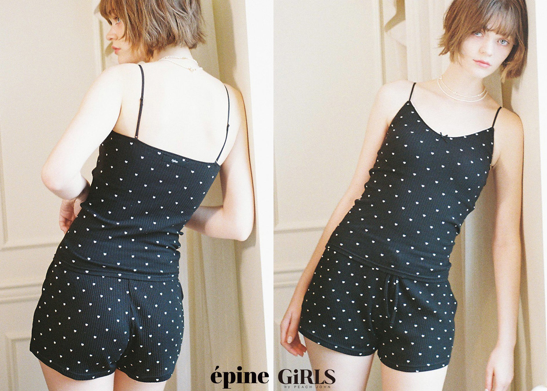 便利なカップ付きキャミソールとボトムのアウターライクなセットアップ。季節問わず着用できる薄手で伸びの良いコットンリブの生地に小さなハートを散りばめた、モノトーンカラーが上品な印象です。背中の中心には”épine”のブランドタグを配したこだわりが詰まったデザイン。