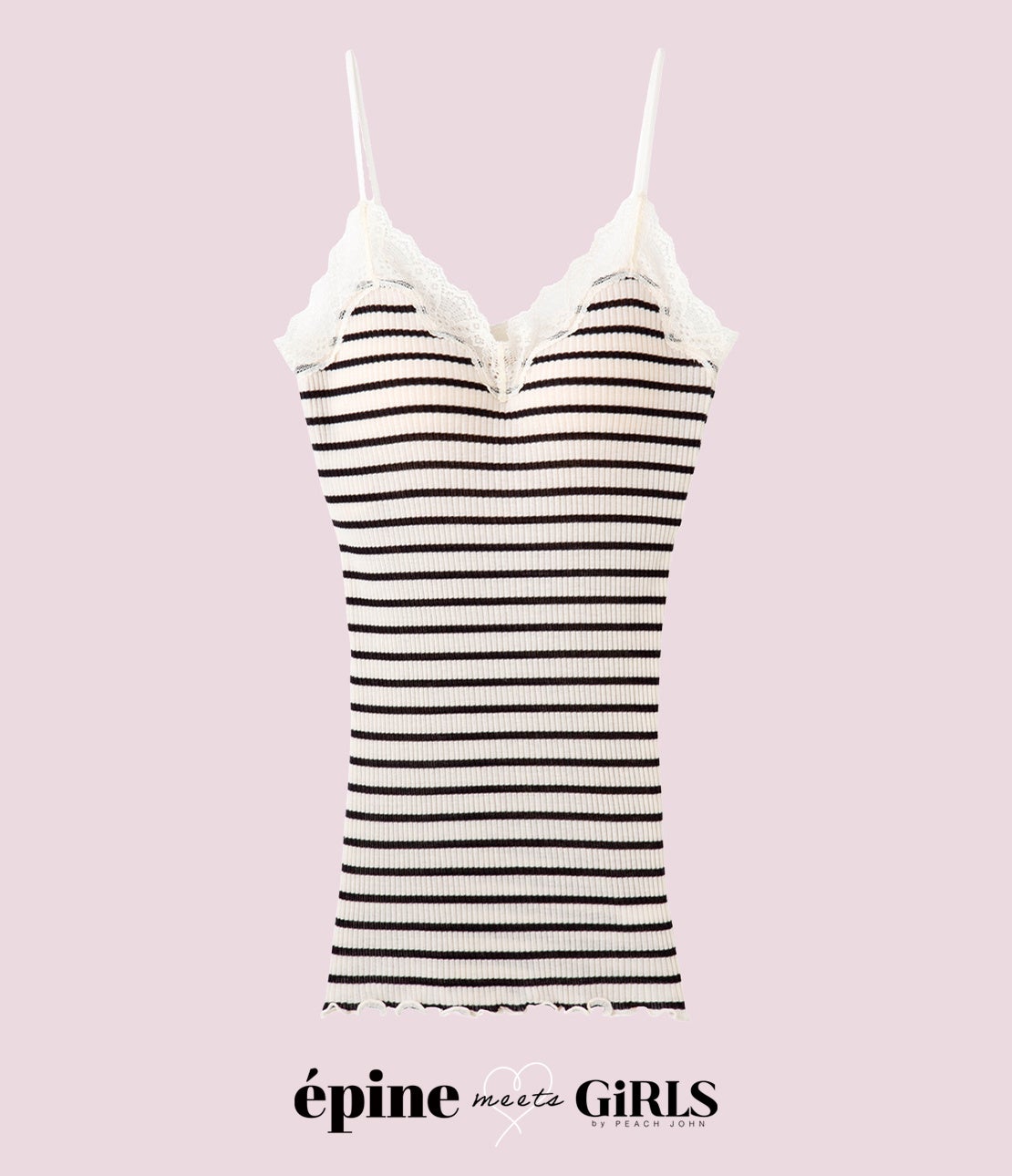 モノトーンボーダーのカップ付きキャミソール。Vネック部分には大振りなレースを配した素肌が透ける軽やかなデザイン。肌触りの良いリブ素材でリラックスタイムにもぴったり。背中の中心には”épine”ブランドタグが縫われています。