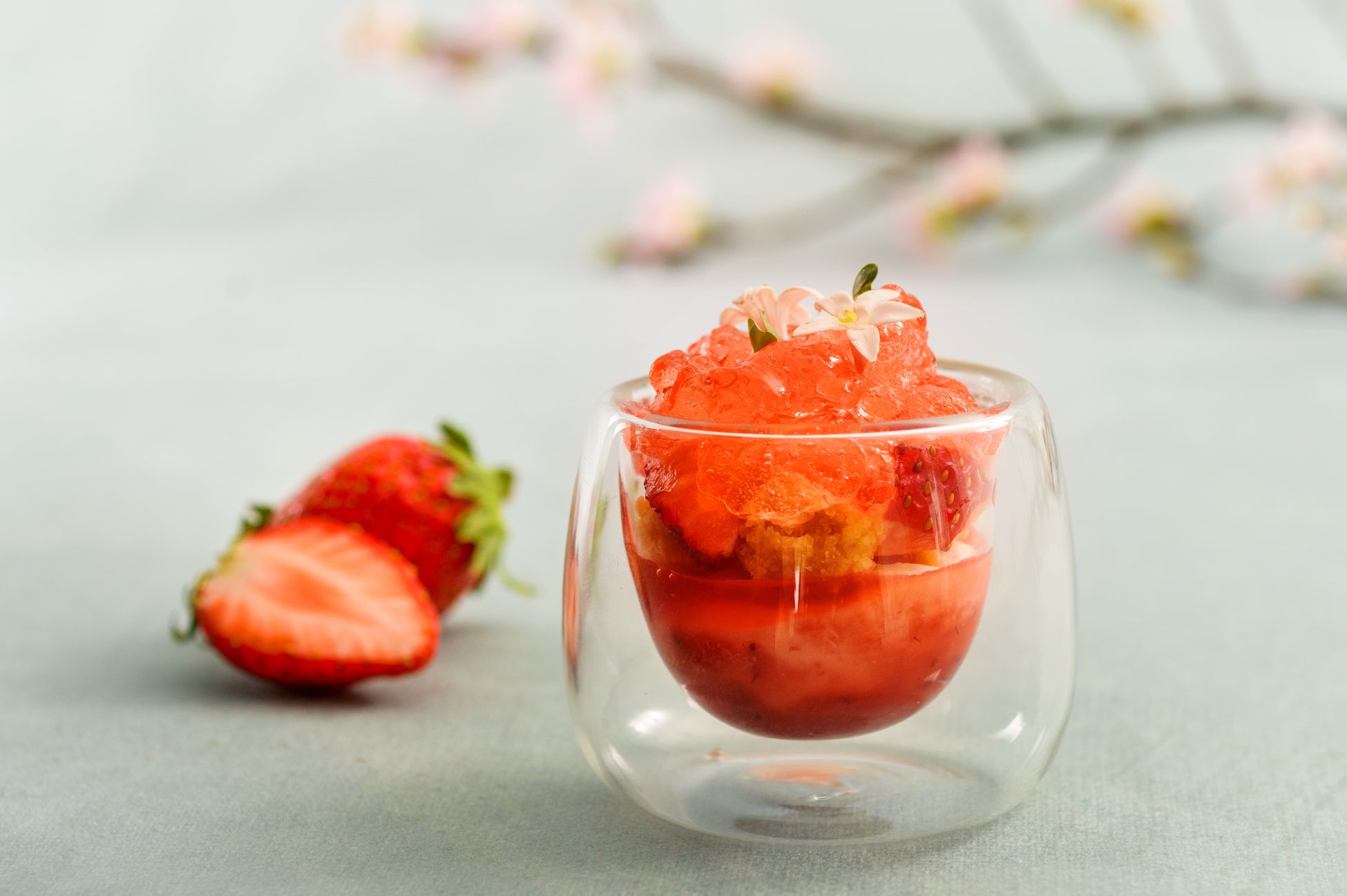 北海道産クリームチーズのレアチーズに桜香るジュレ、“とちおとめ”のソース、フレッシュの“とちおとめ”を組合せました。チーズのコクにいちごの酸味が絶妙なバランスです。