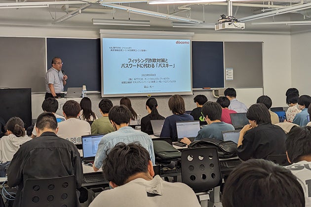 森山氏は、GoogleやAppleなどの世界的企業が参加する「FIDOアライアンス※」執行評議会・ボードメンバーで、日本における「パスワードレス認証」のキーパーソンです。講義では、フィッシング詐欺対策とパスワードに代わる「パスキー」をテーマに、セキュリティの最前線を教えていただきました。