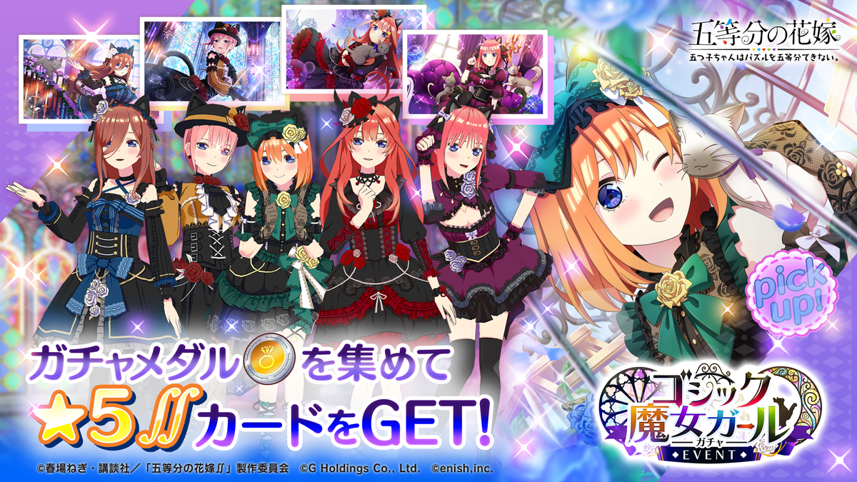 株式会社enish(本社:東京都港区、代表取締役社長:安徳 孝平、以下enish)は、2022年4月15日(金)より、アニメ「五等分の花嫁」初となるゲームアプリ『五等分の花嫁 五つ子ちゃんはパズルを五等分できない。』にて、週刊少年マガジン編集部完全監修のゲームオリジナルストーリーをフルボイスでお楽しみいただける新イベント「五つ子魔女と青いバラの迷宮 ~吾輩は黒猫である!?~」を開催いたします。4月に行われるイベントの特典として伊藤美来さんのサイン入りごとぱず1周年記念ポスターを抽選で1名様にプレゼントいたします。