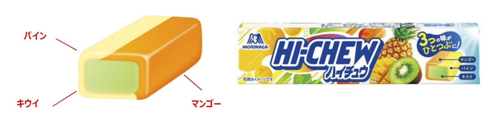 森永製菓株式会社(東京都港区芝浦、代表取締役社長COO・森 信也)は、今年50CHEW(周)年を迎えたソフトキャンディ「ハイチュウ」から、ひと粒で3つのフルーツ(マンゴー・パイン・キウイ)のフレーバーが楽しめる「ハイチュウ<南国ミックス>」を5月7日(水)より期間限定で新発売いたします。爽やかな酸味のキウイをセンターに、外側に甘く濃厚なマンゴーと、甘酸っぱいパインのフレーバーを巻いた構造です。見た目がカラフルで楽しいだけでなく、噛むたびに3種類のフルーツの味が混ざり合うので、味の変化を楽しむことができます。