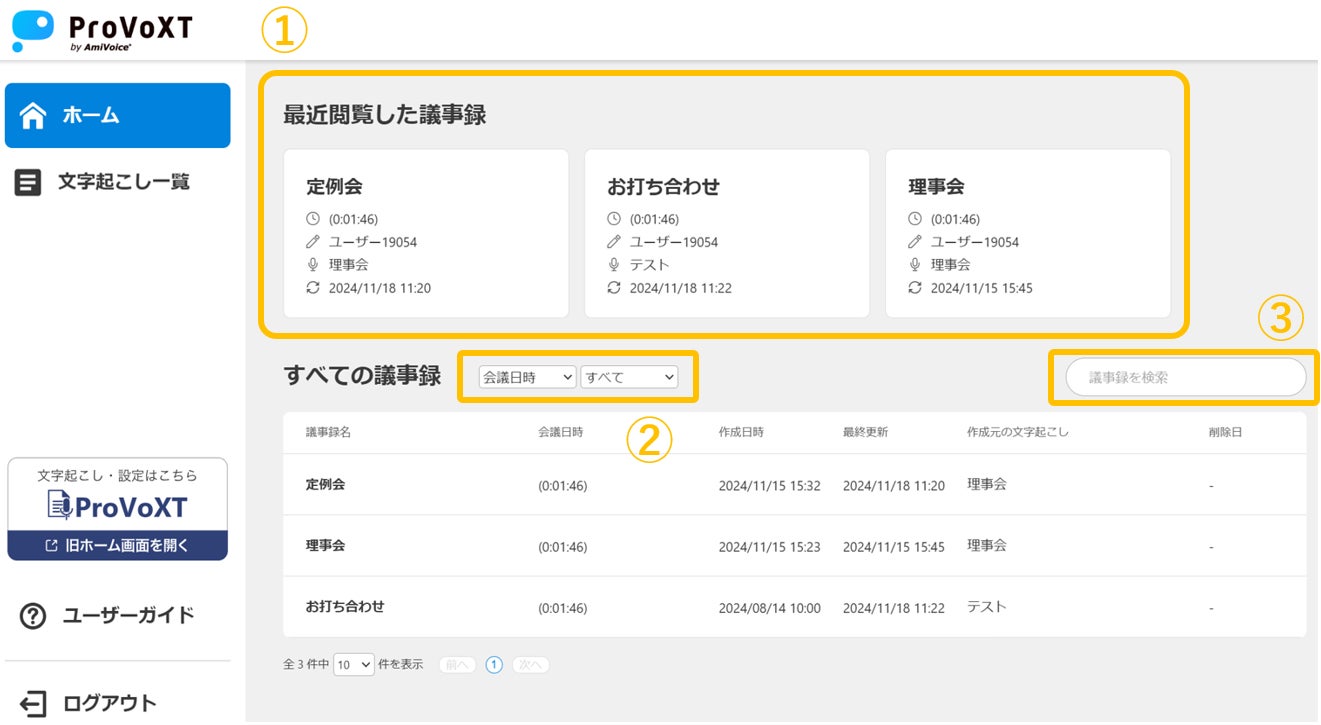 ③「議事録名」「作成元の文字起こし名」で議事録を検索できるようになりました。