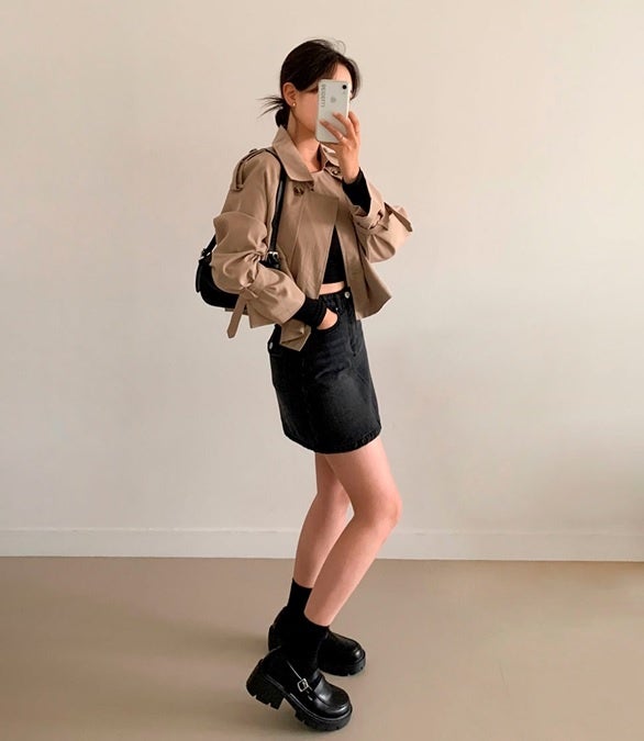 7㎝ヒールと丸みを帯びたデザインで存在感たっぷり。アウター以外は黒でまとめ、コンパクトなミニスカートですっきりと。