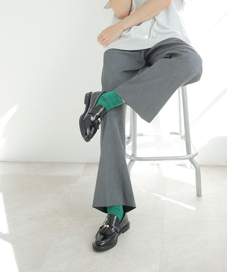 ゴールドパーツのタッセルで足元に遊び心をプラス。センタープレス入りのパンツから覗くカラーソックスがポイント。