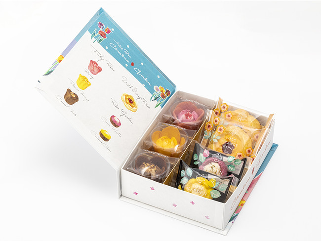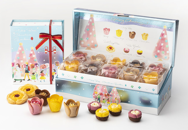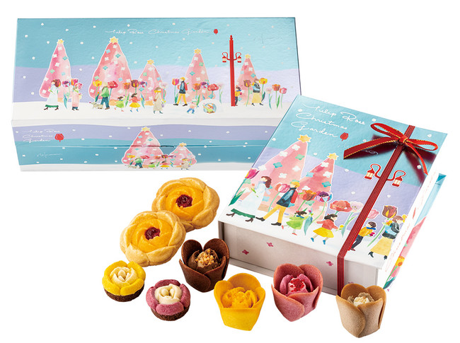 お花のスイーツがあふれだす2段重ねの豪華なボックスは、チューリップタウンの陽気な街角を行き交う人々を描いたクリスマス限定デザイン。秋に登場した最新作「チューリップローズ モンブラン」など、7つのお花が楽しめる詰合せで登場します。みんなで楽しむおうちクリスマスパーティーに、お友達や家族を喜ばせるサプライズギフトにも!