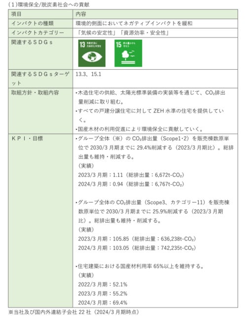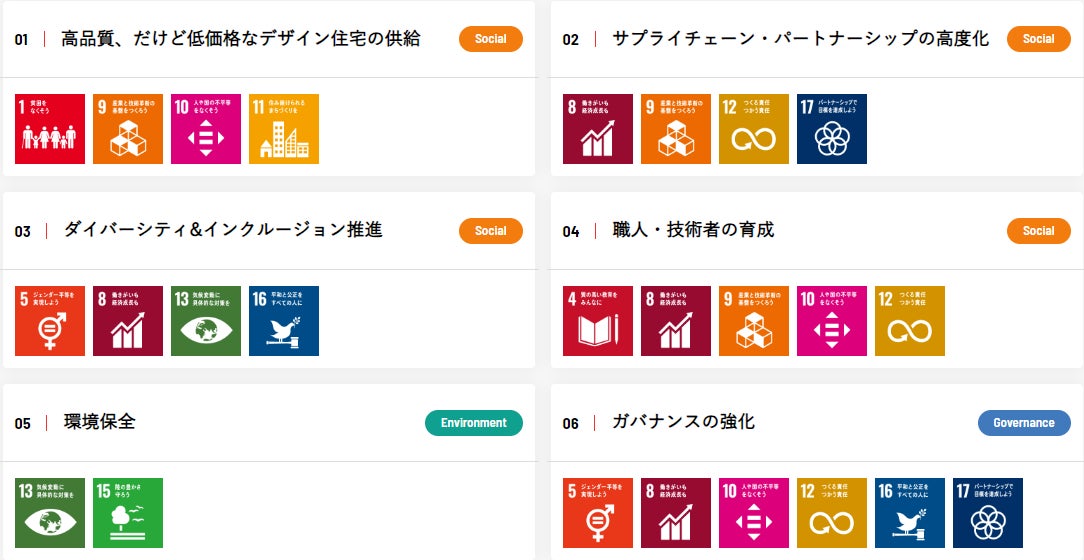 当社グループはより豊かな社会を目指すため、「高品質、だけど低価格なデザイン住宅の供給」「サプライチェーン・パートナーシップの高度化」「ダイバーシティ&インクルージョン推進」「職人・技術者の育成」「環境保全」「ガバナンスの強化」の6つのテーマに取り組んでおります。