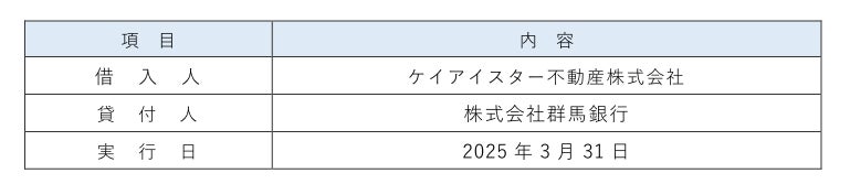 ケイアイスター不動産株式会社(本社/埼玉県本庄市、代表取締役社長/塙 圭二、以下「当社」)は、2025年3月31日、株式会社群馬銀行(本店/群馬県前橋市、代表取締役頭取/深井 彰彦、以下「群馬銀行」)との、「ポジティブインパクトファイナンス」(以下「PIF」)の契約を締結しましたことをお知らせします。