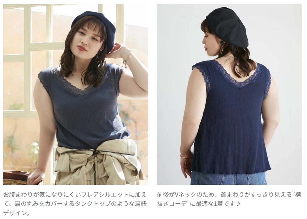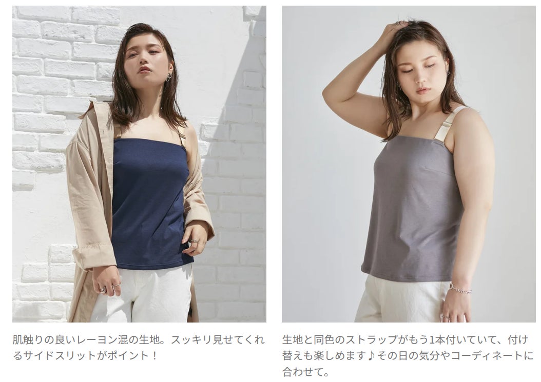 本製品の特長は、カップにワイヤーを内蔵しているため、バストをしっかり支えることで、キレイなシルエットがキープでき、且つ、アウター感覚で着られるキャミソールタイプのためプラスサイズの女性におしゃれを楽しんでいただけます。