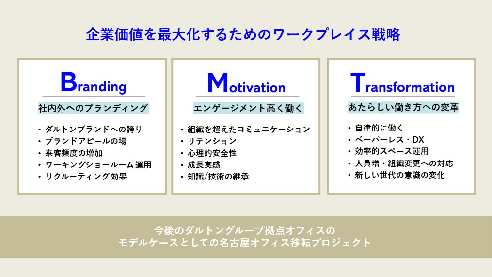 新オフィスは、ダルトンのブランド価値を高め、社員が誇りをもって活き活きと働ける環境を整えることを目的に、コンセプトに「BMT(Branding/Motivation/Transformation)」を設定。