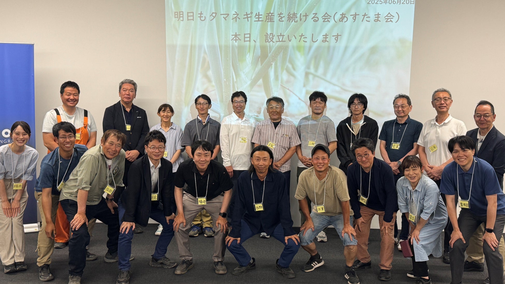 「スマイルボール」の⽣産を担う契約農家と共にタマネギの⽣産安定化や⾷卓での価値を⾼める取り組みを実施する⽣産者グループ「明⽇もタマネギ⽣産を続ける会(あすたま会)」を、2025年6⽉20⽇に発⾜しました。「スマイルボール」の栽培の中で、昨今の気候変動による夏の集中豪⾬や酷暑がタマネギの⽣産に与える影響の⼤きさや、農業⽣産⼈⼝の減少など様々な課題への対策が求められていることを強く感じていました。そこで、契約農家と⼀緒に、タマネギ⽣産を詳細にデータ化した「データ駆動型農業」(※4)と品種開発を開始し活動を進めています。また、バリューチェーンの出⼝となる⾷卓での価値向上に取り組むために、2023年に株式会社農業総合研究所とハウス⾷品グループ本社株式会社が資本業務提携を進め、野菜のブランディングにも着⼿しています。これらの活動をより発展させていくことを⽬指し、⽣産安定化のための“農の場⾯”と消費者にタマネギの価値を届ける“⾷卓の場⾯”を活動の主領域とした⽣産者グループ「明⽇もタマネギ⽣産を続ける会(あすたま会)」を設⽴することとなりました。