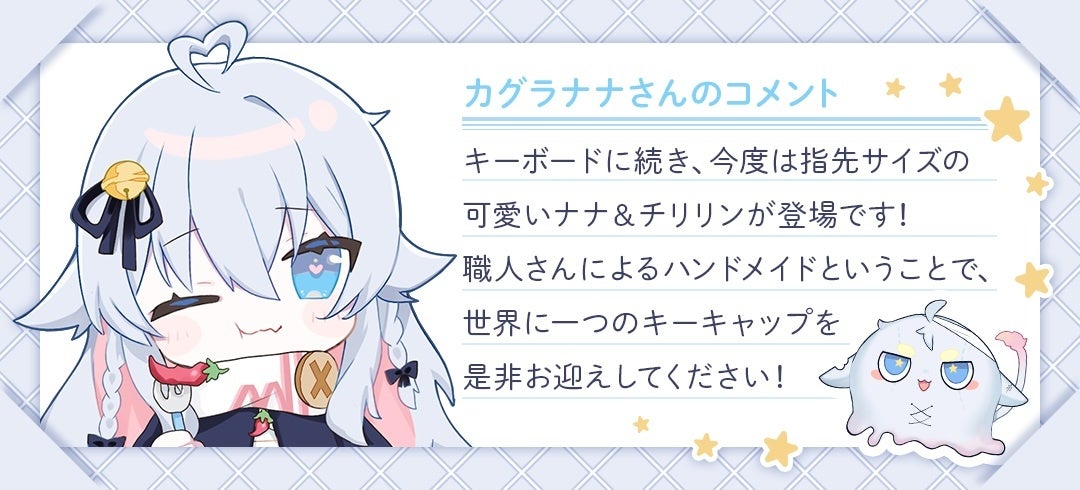 バーチャルアーティスト「カグラナナ」自身がプロデュースを手がける、AMICISとの限定コラボキーキャップが登場!思わず見つめたくなる「ちびナナ」と、一緒に並べたくなる「チリリン」の2つのキーキャップをご用意しました。カグラナナの世界を、指先サイズにぎゅっと凝縮。デスクに “ほっこり” を足したいすべての方にお届けします。