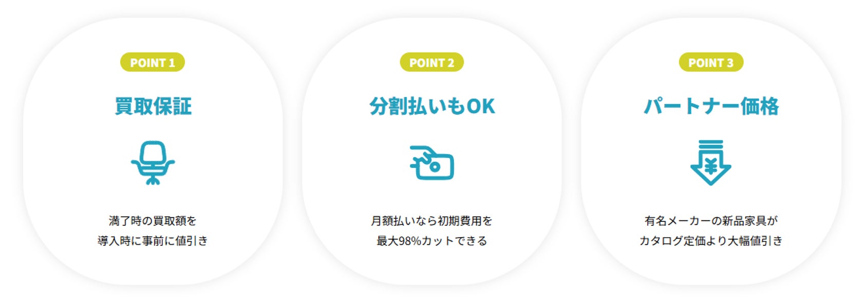 株式会社オフィスバスターズ(本社:東京都千代田区内神田1丁目1番7号 東大手ビル、代表取締役社長:熊谷 正慶、以下「当社」)は、買取保証付きオフィス家具リース「サーキュラーエコリース」の提案を開始しました。「サーキュラーエコリース」は、導入時に将来の買取保証額をあらかじめ差し引くことで、導入費用を抑えながら新品オフィス家具を導入できる仕組みです。契約満了時には、返却・継続・購入の3つの選択肢から、利用状況に応じた運用が可能です。