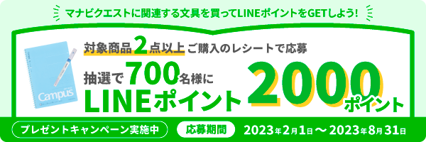 応募方法:「コクヨのマナビ」LINE公式アカウントを友だち追加し、対象商品を2点以上ご購入の商品とレシート画像をトークに投稿してください。