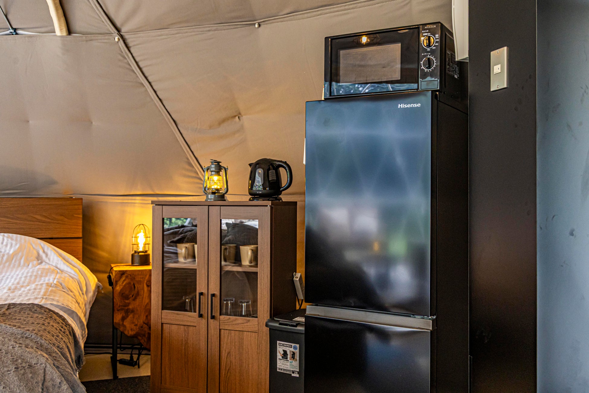 自然豊かな立地ながら、全棟に冷暖房、冷蔵庫、専用食事スペースを完備。アウトドアの開放感を味わいつつも、ホテルのような快適さを維持しています。冷蔵庫内のドリンクも無料で提供しており、手ぶらでも気軽に快適な滞在が可能です。