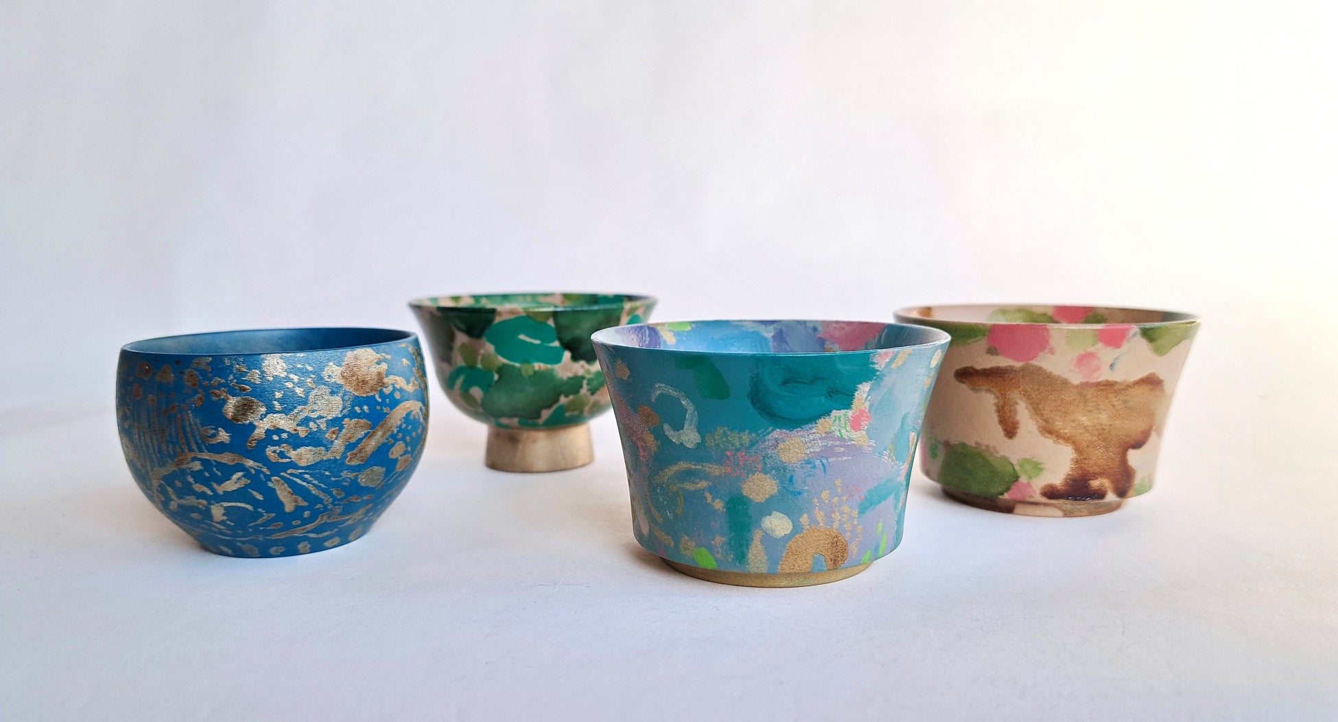 故郷岐阜の豊かな自然の風景から受けとめた、四季折々の色、光、においなどの空気感を思い出や記憶と共に込めて、即興的に漆で塗り描いた器たち。全て一点ものの「使って育てるアート作品」を制作。