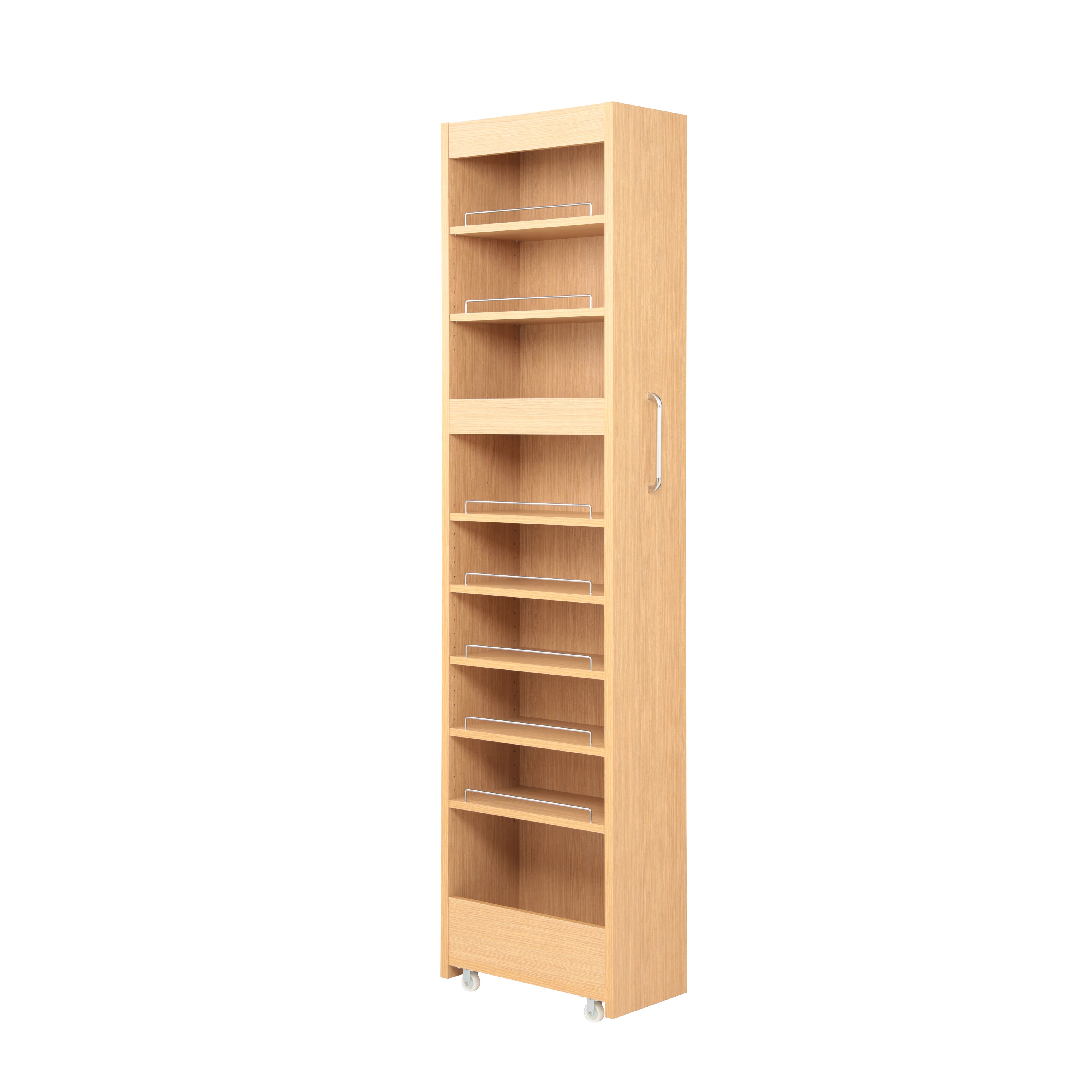オープンタイプで必要な時にサッと取り出せ、キャスター付きで前後の動きもラクラク。3cm間隔の可動棚板は収納物の高さに応じて設定できます。総耐荷重は約90Kgの公的検査をクリアした、丈夫で安心な設計。収納物の落下を防ぐ背板付きで、ハンドルを前後に付け替えるだけでオープン部分を左右どちらにも設定できます。さらに、スパイスなどがこぼれ落ちないよう、収納棚にこぼれ止めワイヤーを付けました。