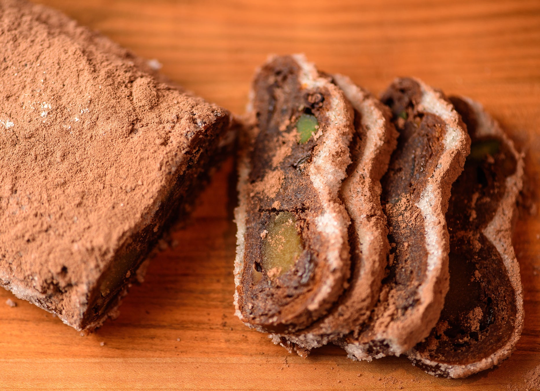 生地にココアパウダーを練り込み、チョコレートと相性の良いマカダミアナッツとピスタチオ、レーズン、チョコチップを入れました。チョコレートの甘みと苦みが心地よいシュトーレンです。