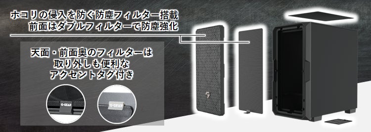 天面・前面・底面には、防塵フィルターを標準搭載。さらに前面はダブルフィルターによりパソコンにとって大敵であるホコリの侵入を徹底的に防ぎます。また、天面・前面奥のフィルターにはG-GEARロゴ入りのアクセントタグを配置。フィルターの取り外しを簡単にする実用性も兼ね備えています。